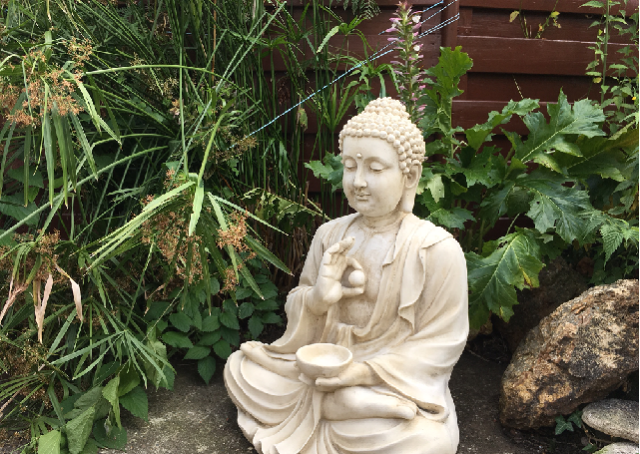Peu à peu j’ai mis en place les différents conseils vus en stage dans ma maison en forme de L ( cristal, plantes, carillons, redécoration d’une chambre d’ado, nouveau fourneau etc ) et voici la photo de mon Bouddha enfin posé hier sur ma terrasse afin de corriger la surface manquante! L’essentiel, mais pas facile à dénicher!
